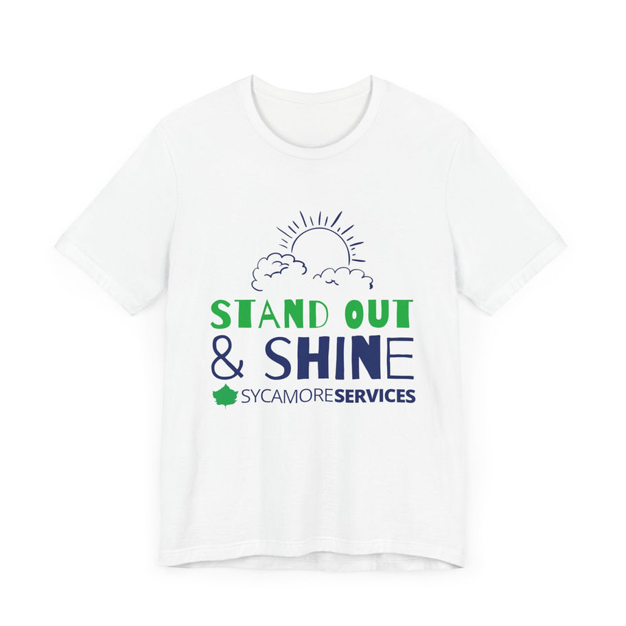 Brighten your day and share a message of positivity and inclusion with the Sycamore Services Unisex Jersey Short Sleeve Tee. Designed to inspire joy and connection, this tee features vibrant graphics and uplifting messages that reflect the heart of Sycamore’s mission—empowering people of all abilities to live full, meaningful lives.